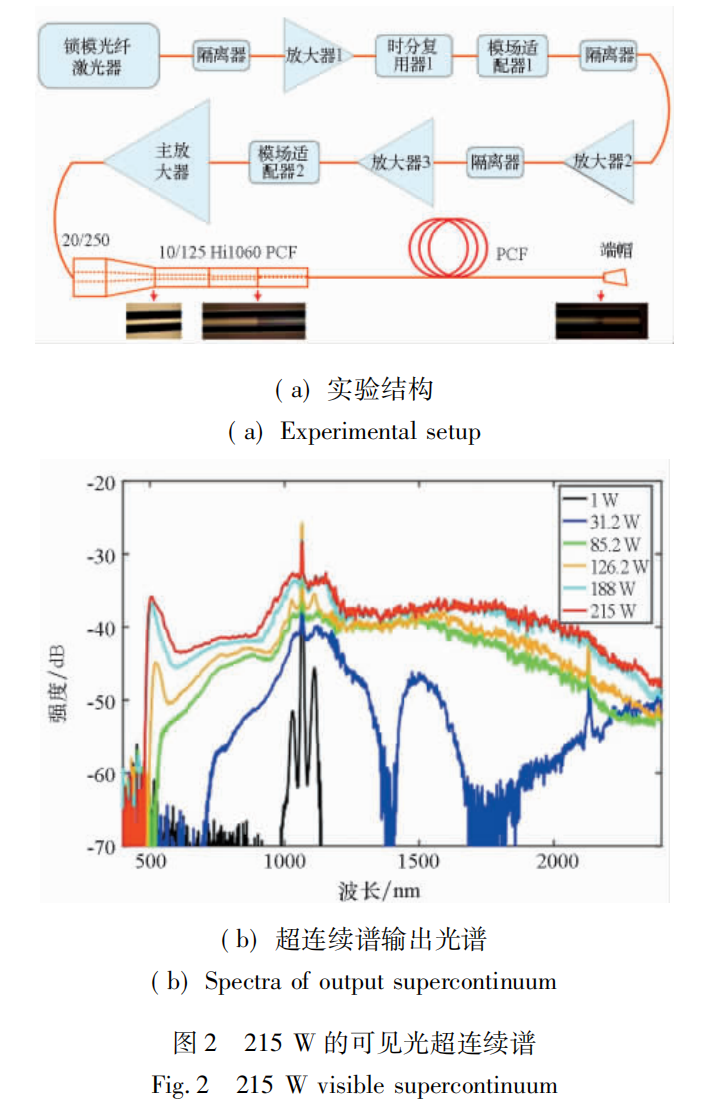 光纤中掺杂化合物可以提高 PCF 的非线性, 如 PCF 中掺杂 GeO2 可以增强拉曼响应和克尔效 应,但掺杂使光纤的零色散波长红移,为有 效产生可见光超连续谱,通常需要拉锥或特殊结 构设计( 如 Y 形芯) 改变光纤参数。多波长泵浦方案中,可通过非线性晶体倍频产生多波长泵浦源,或者通过 PCF 四波混频获得多波长泵浦源后 再级联另一种 PCF 产生可见光超连续谱。 在遥感成像、遥感探测等领域,期望获得更高功率的超连续谱光源。为获得较高的非线性系 数,用于产生超连续谱的 PCF 模场面积通常较 小。而作为超连续谱产生的泵浦激光,为获得高功率需要选用较大模场面积的增益光纤。高功率超连续谱产生过程中选用的增益光纤与 PCF 的模场面积相差数倍甚至一个数量级以上。因此, 为实现高功率超连续谱光源,不仅需要攻克高光束质量的脉冲光纤激光器、高性能光子晶体光纤设计与制作等关键技术,还需要解决大模场光纤与 PCF 的低损耗熔接问题,目前常采用的技术方案有光纤拉锥、PCF 选择性空气孔塌缩、增加过渡光纤等。当前,基于单芯 PCF 的可见光超连续谱输出功率已突破百瓦量级。2018 年,中国工程 物理研究院 Zhao 等基于单芯 PCF 实现了输出功率为 215 W 的可见光超连续谱光源,实验结构和输出 光 谱 如 图 2 所 示。实 验 采 用 功 率 为556 W的皮秒脉冲光纤激光器泵浦一段纤芯直径为4. 8 μm 的 PCF,获得了输出功率为 215 W 的超连续谱,光谱覆盖 480 ~ 2000 nm,首次报道了光谱覆盖 500 nm 以下可见光,输出功率超过 200 W的超连续谱光源。单芯 PCF 的模场面积较小,进一步提升功率的难度较大。从理论上讲,采用多芯 PCF 在大功率可见光超连续谱产生方面具有较大潜力,多芯PCF 的有效模场面积大,容易实现与泵浦激光的模场匹配,可承受更高的功率,而且结构设计灵活,可获得有利于可见光超连续谱产生的色散特性。近年来,基于多芯 PCF 的可见光超连续谱输出功率得到了不断提升。2017 年,国防科技大学 Qi 等以七芯 PCF 为非线性介质,获得了输出功率为 80. 7 W、光谱覆盖 350 ~ 2400 nm 的可见光超连续谱,实验结果如图 3( a) 所示,超连续谱在整个可见光波段的谱功率密度均大于 50 mW/nm。图 3( b) 为实验中所使用的七芯 PCF 截面图,其空气孔直径、间距和占空比分别为 3. 33 μm、3. 91 μm 和 0. 85。近红外波段超连续谱光源是指输出光谱的主 要成分处于 0. 8 ~ 2. 5 μm 之间的超连续谱。当 前,产生近红外波段超连续谱的方式主要有以下 三种: 一是使用脉冲光纤激光器泵浦 PCF 或普通光纤; 二是在脉冲光纤放大器中直接产生近红外超连续谱; 三是用随机光纤激光器产生近红外超连续谱。使用脉冲光纤激光器泵浦 PCF 产生近红外超连续谱的实验方案与可见光超连续谱产生时的相同,但比可见光产生的限制条件少,不需 要满足可见光产生时的群速度匹配。脉冲激光泵 浦普通光纤也可以产生近红外超连续谱,普 通光纤的零色散点在 1. 3 μm 左右,使用常见的1 μm波段脉冲激光作为泵浦源时,泵浦光处于正常色散区,拉曼效应和自相位调制会促使激光频率红移,产生近红外超连续谱。在大功率超连续谱产生方面,PCF 也实现了数百瓦的超连续谱输出。2018 年,中国工程物理研究院攻克了千瓦级皮秒脉冲光纤激光器、PCF 高效耦合等技术难题, 实现了全光纤结构、输出功率为 563 W 的超连续谱光源。 在光纤放大器中直接产生超连续谱时,放大器的增益过程与非线性效应、色散效应共同作用 促使光谱展宽,光谱展宽后处于增益范围内的新光谱成分会得到放大,从而又促进了非线性效应。该方案中,可以使用较大模场面积的增益光纤作为非线性介质,在大功率超连续谱产生方面极具潜力,掺 镱 光 纤 放 大 器 ( Ytterbium-Doped Fiber Amplifer,YDFA) 、铒/镱 共 掺 光 纤 放 大器和 掺 铥 光 纤 放 大 器( Thulium-Doped Fiber Amplifier,TDFA) 中均有超连续谱产生。2013 年,国防科技大学 Song 等基于掺镱光纤放大器实现了 177 W 的近红外超连续谱输出,掺镱光纤的纤芯直径为 30 μm,输出超连续谱的 10 dB光谱宽度为 740 nm,输出结果如图 4 所示。2019 年,复旦大学 Yao 等基于掺铥光纤放大器实现了 142 W 的超连续谱输出,掺铥光纤的纤芯直 径为 25 μm,输出超连续谱的 10 dB 光谱宽度为 615 nm,输出结果如图 5 所示。