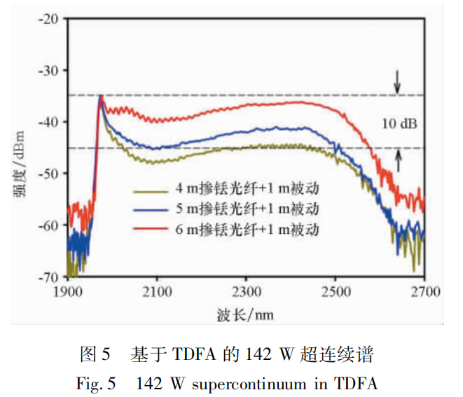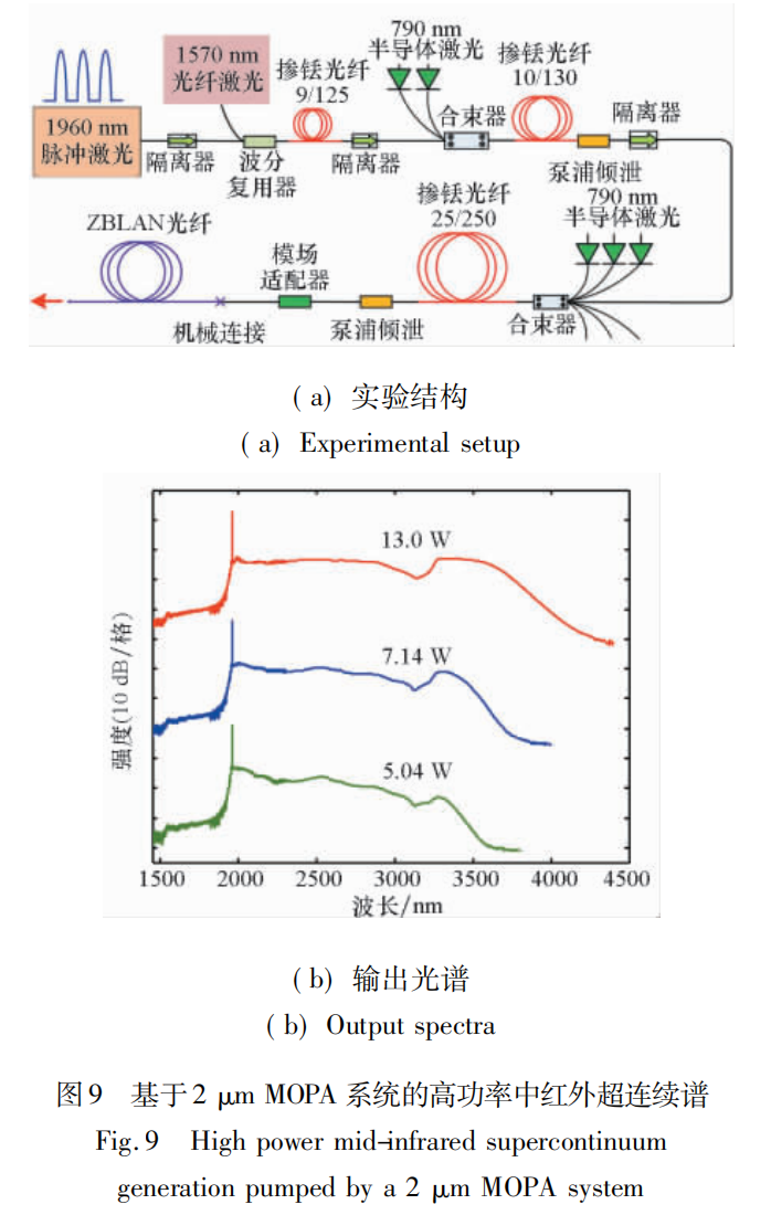 中红外波段超连续谱并没有严格的定义,也 有文献将 2 ~ 2. 5 μm 波段的超连续谱称作中红外超连续谱。通常情况下,在军事领域将 3 ~ 5 μm波段称为中红外波段。本文所指的中红外超连续谱是长波边超过 3 μm 的超连续谱光源。由于中红外波段的超连续谱光源处于大气传输窗 口,涵盖众多分子的特征谱线,在生物医学、环境监 测 和 国 防 安 全 等 领 域 有 广 阔 的 应 用 前 景,是当前超连续谱研究热点之一。普通石 英( SiO2 ) 光纤对于 3 μm 以上的光具有较大的传 输损耗,中红外超连续谱的产生主要使用软玻璃光纤,常见的软玻璃光纤材料有: 氟化物玻璃、亚碲酸盐玻璃和硫系玻璃,不同光纤传输损耗曲线如图 8 所示。中红外超连续谱产生的技术难点在于以下几个方面: 一是高性能软玻璃光纤的制造; 二是适合超连续谱产生的泵浦光源研制; 三是软玻璃光纤的端面处理与低损耗连接。与石 英光纤相比,软玻璃光纤呈现易碎、易断的脆弱物 理特性,且材料的熔点较低,例如 ZBLAN 材料的 熔点 为 455 ℃,而 石 英 材 料 的 熔 点 高 达 1434 ℃,因此软玻璃难以实现和普通光纤的低损 耗连接。氟化物光纤拉制技术成熟,且材料的自聚焦 阈值高于亚碲酸盐和硫系玻璃,更适合高功率中红外超连续谱的产生; 但由于传输损耗的限制, 以氟化物光纤为非线性介质的中红外超连续谱长 波边难以突破 5 μm。用于产生中红外超连续谱的氟化物光纤主要有两类: ZBLAN 光纤和 InF3光纤。2006 年,美 国 威 斯 康 星 大 学 麦 迪 逊 分 校 Hagen 等首次 提 出 了 1. 55 μm 脉 冲 激 光 泵 浦ZBLAN 光纤产生中红外超连续谱的研究,获 得了光谱覆盖 1. 8 ~ 3. 4 μm、输出功率为 5 mW的超连续谱。2009 年,美国密西根大学 Xia 等以 ZBLAN 为非线性光纤,首次获得了平均功率超过 10 W 的中红外超连续谱,输出光谱覆盖 0. 8 ~ 4 μm。早期的研究中,中红外超连续谱产生的泵浦源主要为 1. 55 μm 脉冲光纤激光器。近 年来掺 铥 光 纤 激 光 器 取 得 了 快 速 的 发 展,与 1. 55 μm相比,2 μm 波段更易获得高功率输出, 且 2 μm 波长离中红外波段更近,因此基于 2 μm脉冲光纤激光器提升中红外超连续谱的输出功率和长波长的功率比例成为新的尝试。2014 年,国 防科技大学 Yang 等以 2 μm 波段脉冲光纤激光器及放大器为泵浦源,以 ZBLAN 光纤为非线性介质,实现了平均功率为 13 W、光谱覆盖 1. 9 ~ 4. 3 μm的中红外超连续谱,实验方案及结果如 图 9 所示。随后,北京工业大学 Liu 等采用类 似方案,获得了功率为21. 8 W、光谱范围为1. 9 ~ 3. 8 μm的中红外超连续谱。2017 年,国防科技大学 Yin 等进一步改进实验方案,实现了全光 纤结构、输出光谱超平坦的 15. 2 W、1. 9 ~ 4. 2 μm中红外超连续谱。由于传输损耗的限制,基于 ZBLAN 光纤的超连续谱长波边限制在 4. 5 μm 左右,InF3 光纤与ZBLAN 光纤具有相似的物理特性,但在 4 ~ 5 μm波段的传输损耗较低。随着 InF3 光纤制造和处 理技术的成熟,近年来以 InF3 为非线性介质产生中红外超连续谱的输出性能不断得到提升。2018 年,国防科技大学突破了石英光纤与 InF3 光纤的低损耗熔接技术( 2 μm 波长处的熔接损耗低 至 0. 07 dB) ,利用宽谱掺铥光纤放大器输出的2 ~ 2. 5 μm 宽谱激光泵浦 InF3 光纤,实现了平均功率为 1. 35 W、光谱覆盖范围为 1. 5 ~ 5. 2 μm 以 及平均功率为 4. 06 W、光谱覆盖范围为 1. 9 ~ 5. 1 μm的光谱平坦型中红外超连续谱。亚碲酸盐玻璃是指含有 TeO2 的化合物玻璃,大多数亚碲酸盐玻璃的透光范围和氟化物玻璃相近,但其非线性系数要高于氟化物[1]。由于亚碲酸盐材料中的 OH - 1 振动吸收损耗问题( 主要位 于 3 ~ 4 μm 波段) 难以解决,亚碲酸盐光纤在中红外波段的损耗要远大于氟化物光纤,这是长期 以来亚碲酸盐光纤没有得到商业化应用的主要原因之 一。通 过 脱 水 技 术 创 新,减 少 材 料 中 的OH - 1含量是提升亚碲酸盐光纤传输效率的关键,近年来的研究中,通过掺入卤族元素降低 OH - 1吸收,可将亚碲酸盐光纤的吸收峰降至 10 dB /m左右。2013 年,美国 NP Photonics 公司采用 独特的脱水技术,制造出超低 OH - 1 含量的亚碲酸盐玻璃,成功拉制出在可见光到中红外波段( 0. 6 ~ 4. 5 μm) 传输损耗均小于 0. 5 dB /m 的高质量光纤,并以 2 μm 脉冲激光作为泵浦源,实现了输出功率为 1. 2 W,光谱范围为 1 ~ 5 μm 的中红外超连续谱[69]。2018 年,吉林大学 Yao 等研制了低损耗的亚碲酸盐光纤,并利用 2 μm 波段飞秒脉冲光纤激光器作为泵浦源,实现了平均功率为 10. 4 W、光谱覆盖范围为 0. 9 ~ 3. 9 μm 的中红外超连续谱,证实了亚碲酸盐光纤实现高功率中红外超连续谱的潜力。实验结构和输出光谱如 图 10 所 示,图 10 ( b ) 中 标 注 的 功 率 为1980 nm飞秒激光器的输出功率,当飞秒激光器的功 率 为 15. 9 W 时,超 连 续 谱 输 出 功 率 为10. 4 W。( a) 实验结构( a) Experimental setup硫系玻璃包括单组分的 As2 Se3、As2 S3、GeS2玻璃及含 As、Sb、Se、He 和 S 等的多组分玻璃。
