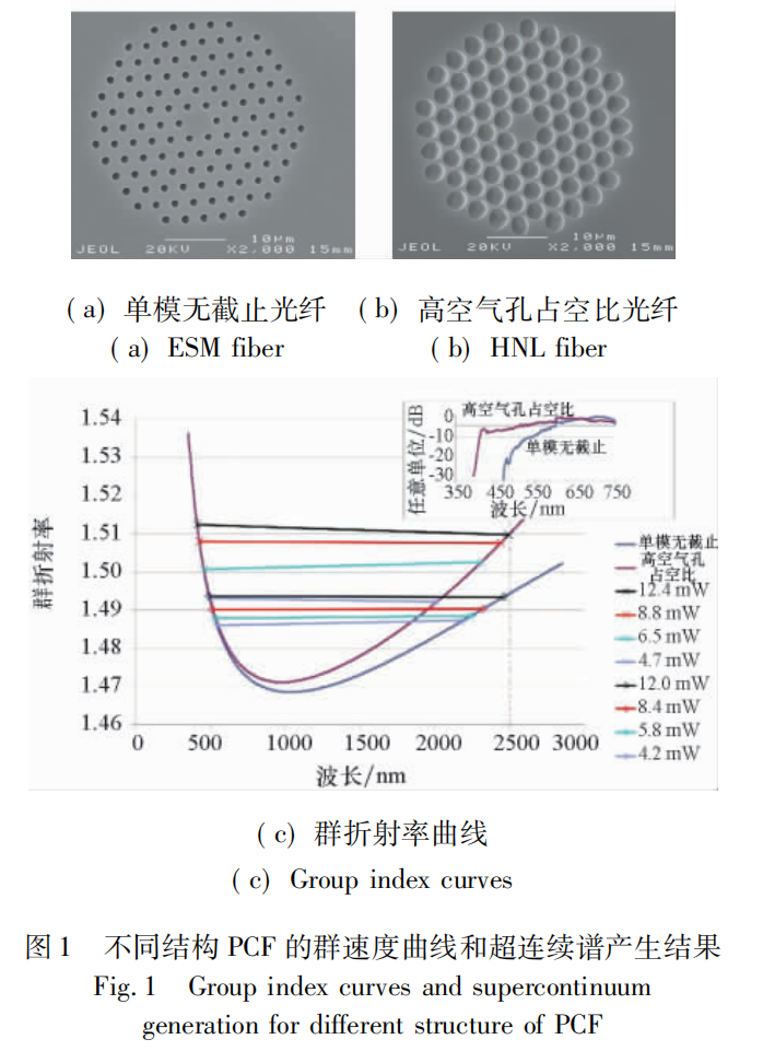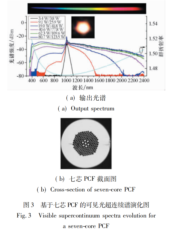 经多年发展,超连续谱的产生已有多种解决方案,在泵浦选择上有连续波激光、纳秒激光、皮 秒激光、飞秒激光等,产生超连续谱的非线性介质有 PCF、普通光纤、增益光纤、软玻璃光纤等,超连续谱激光的光谱范围可以轻易覆盖可见至近红外波段,还可延伸至紫外、中红外波段,甚至远红外波段。超连续谱光源也获得了诸多实际应用,如光纤通信、精密时间及频率测量、光学相干层析成 像和非线性光谱学等。本文重点介绍以光纤为非线性介质的超连续谱研究进展情况。 可见光波段增强的超连续谱通常简称为可见光超连续谱,该类型光源在生物医疗成像领域有着重要应用,如光学相干层析成像、荧光共焦显微成像、相干反斯托克斯拉曼散射显微成像等。脉 冲激光泵浦 PCF 是产生可见光超连续谱的常用方案,通常有三种增加可见光成分的基本方法: 一 是,通过 PCF 的物理结构参数,灵活改变光纤的色散特性,从而满足可见光产生所需的匹配条件; 二是,通过改变 PCF 的掺杂材料,调整光纤的色 散和非线性特性,促进可见光产生; 三是,采用多 波长泵浦 PCF,充分利用自相位调制、四波混频等非线性效应产生可见光成分。也可综合使用几种基本方法来产生可见光超连续谱。 采用高空气比的 PCF、拉锥PCF或级联 PCF都属于改变 PCF 结构参数提升可见光成分的方法。改变结构参数以及改变 PCF 的掺杂材料,都是为了调整光纤的群速度色散和非线性系数,使光谱在演化过程中更容易满足群速度匹配条件,以及获得更高效的非线性效应,从而有利 于短波长光谱成分的产生。2008 年,英国巴斯大 学 Stone 等对比分析了不同结构 PCF 对可见光超连续谱产生的影响。实验中使用的 PCF 参数 和试验结果如图 1 所示。图 1( a) 为常规单模无截止( Endless Single Mode,ESM) 光纤,图 1( b) 为 高空气孔占空比光纤,两种光纤的纤芯尺寸均为4. 7 μm,空 气 孔 占 空 比 分 别 为 0. 43 和 0. 77。图 1( c) 为不同光纤的群折射率曲线,图中直线为不同输出功率下超连续谱的长波边界和短波边界的连线,图 1 ( c) 中的插图为超连续谱的短波边 界。使用高空气孔占空比的 PCF 明显拓展了超连续谱向可见光展宽的程度,和常规的单模无截止 PCF 相比,高空气孔占空比 PCF 在长波长区域 的群折射率曲线更为陡峭,更容易实现与短波长 区域的群速度匹配,有利于光谱的蓝移。