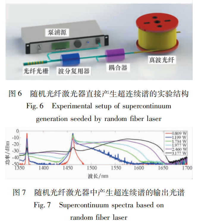 随机光纤激光器是一种新型的光纤激光器,可利用光纤中的瑞利散射提供随机分布 反馈,从而代替传统激光器的谐振腔结构,还可以利用被动光纤中的受激拉曼散射提供增益,具有结构简单、时域稳定等优点。2010年,英国阿斯顿大学 Turitsyn 等运用了一种开腔结构的随机激光器,利用光纤中的瑞利散射和拉曼效应实现激光反馈和增益放大,首次提出随机分布反馈光纤激光器概念。近年来,随机光纤激光器发展迅 速,在理论和实验研究上均取得了较大进展,在大功率光纤激光器研制方面,随机光纤激光器的输出功率已突破 3000 W。当前,利用随机光纤激光器产生超连续谱的研究尚处于起步阶段,但该方案作为一种高鲁棒性、高性价比的实现方案,具有很大的商业潜力。2016 年,上海交通大学 Tang 等将随机光纤激光器作为泵浦源,研究了硫化物光纤中超连续谱的产生。2017 年,电子 科技大学 Ma 等首次报道了随机光纤激光器中直 接产生超连续谱的实验研究,实验结构如图 6 所示。随机光纤激光器采用半开腔结构,中心工 作波长为 1365 nm 的拉曼激光器为泵浦源,半开 腔中光纤光栅的中心工作波长为1461 nm,被动光纤的长度约为 16 km。当泵浦功率为 3. 177 W 时,得到了 20 dB 宽度为 250 nm 的超连续谱输出,结果如图 7 所示。基于该方法,课题组还进一 步优化了实验结果。